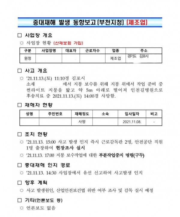 <중대재해> 지붕 보수 작업 중 떨어짐(추락)