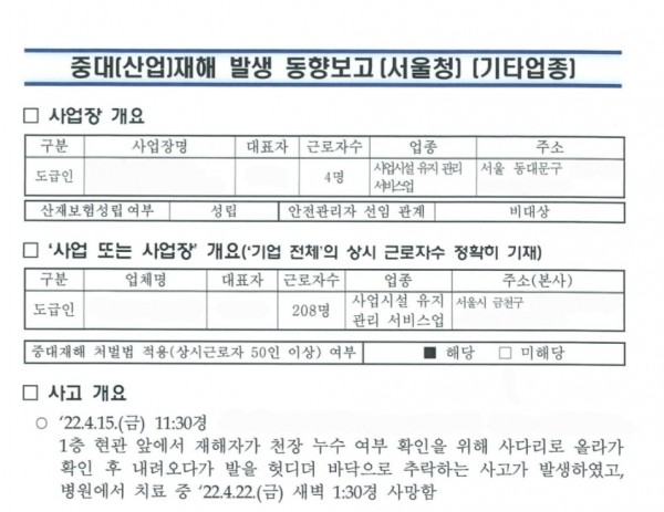 <중대재해> 천장 누수 확인 중 사다리에서 떨어짐 페이지 정보 작성자 안전경영컨설팅 작성일22-06-07 10:23 조회5,423회 댓글0건 관련링크 이전글 다음글 목록 본문 . 댓글목록 등록된 댓글이 없습니다. 이전글 다음글 목록