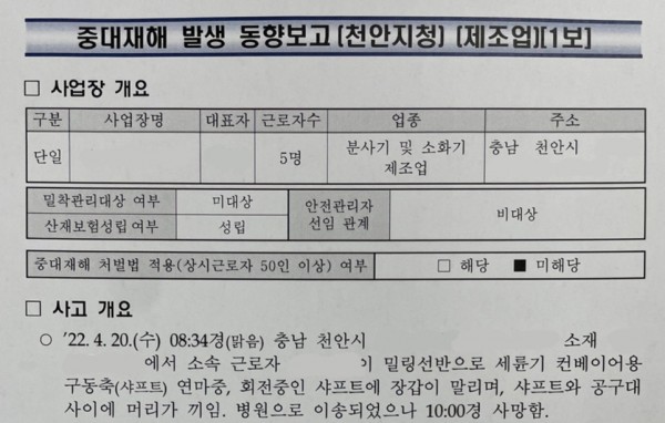 <중대재해> 밀링선반 작업 중 샤프트에 장갑 말려 끼임 페이지 정보 작성자 안전경영컨설팅 작성일22-06-07 10:24 조회5,802회 댓글0건 관련링크 이전글 다음글 목록 본문 . 댓글목록 등록된 댓글이 없습니다. 이전글 다음글 목록