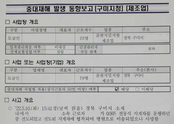 <중대재해> 전동지게차 운행 중 지게차 전도로 인한 깔림 페이지 정보 작성자 안전경영컨설팅 작성일22-06-07 10:26 조회5,493회 댓글0건 관련링크 이전글 다음글 목록 본문 . 댓글목록 등록된 댓글이 없습니다. 이전글 다음글 목록