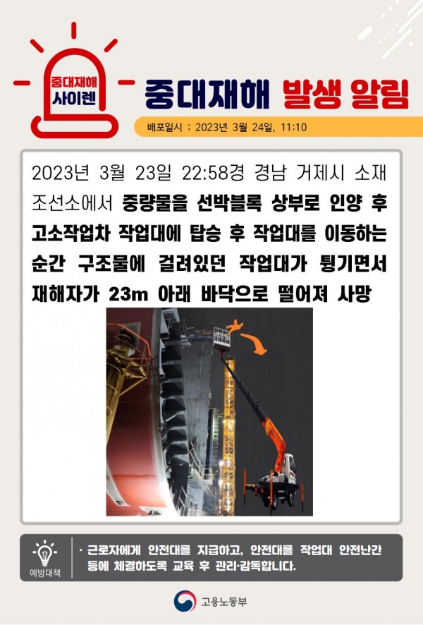 <중대재해> 조선소 고소작업차 작업 중 근로자 추락 페이지 정보 작성자 안전경영컨설팅 작성일23-03-28 09:04 조회4,494회 댓글0건 관련링크 이전글 다음글 목록 본문 . 댓글목록 등록된 댓글이 없습니다. 이전글 다음글 목록
