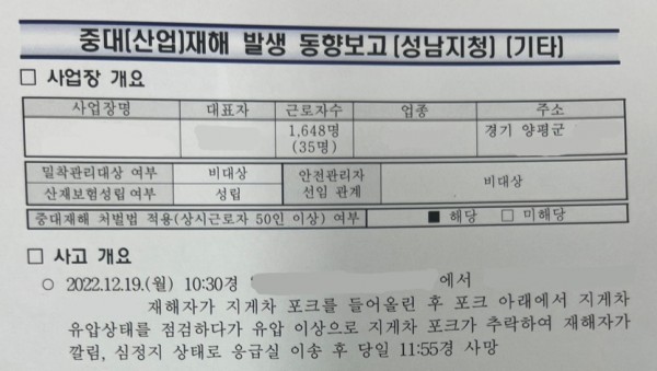 <중대재해> 지게차 점검 중 포크에 깔림 페이지 정보 작성자 안전경영컨설팅 작성일23-03-28 09:04 조회4,764회 댓글0건 관련링크 이전글 다음글 목록 본문 . 댓글목록 등록된 댓글이 없습니다. 이전글 다음글 목록