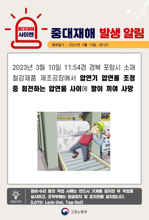 <중대재해> 철강제품 제조업 압연롤 끼임 재해 페이지 정보 작성자 안전경영컨설팅 작성일23-03-28 09:05 조회5,242회 댓글0건 관련링크 이전글 다음글 목록 본문 . 댓글목록 등록된 댓글이 없습니다. 이전글 다음글 목록