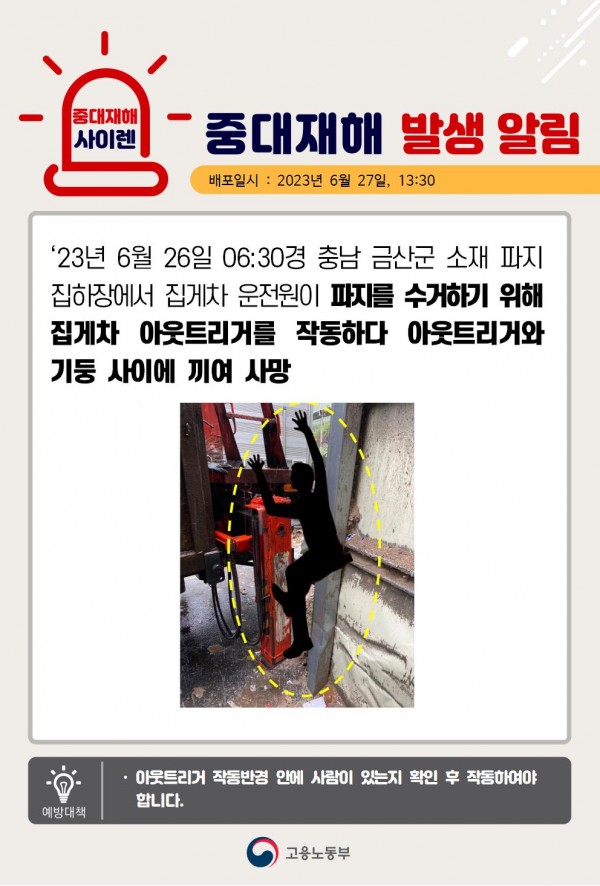 <중대재해> 집게차 운전원 파지 수거 중 아웃트리거 끼임 사망 페이지 정보 작성자 안전경영컨설팅 작성일23-08-31 16:42 조회4,836회 댓글0건 관련링크 이전글 다음글 목록 본문 . 댓글목록 등록된 댓글이 없습니다. 이전글 다음글 목록
