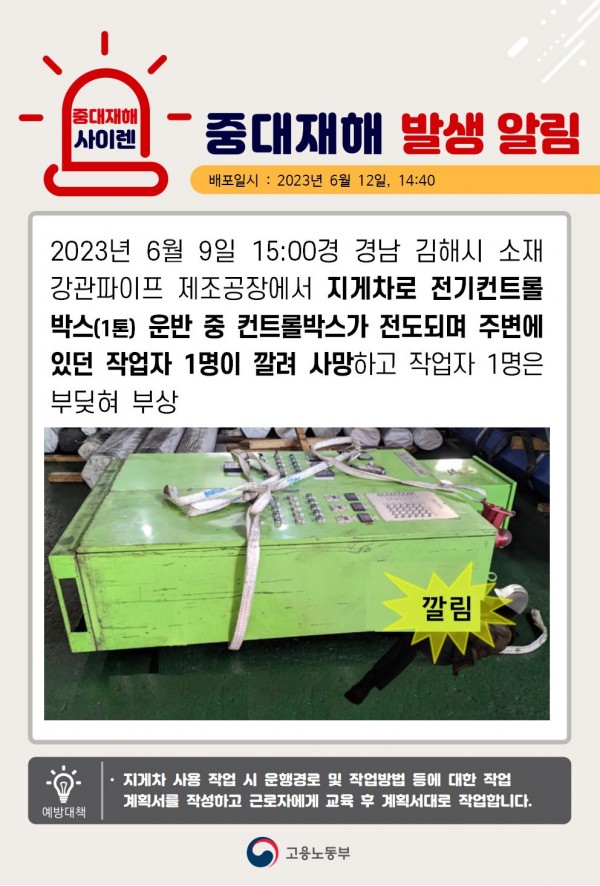 지게차 전기 컨트롤 박스 운반 중 깔림 재해. 페이지 정보 작성자 안전경영컨설팅 작성일23-08-31 16:47 조회4,279회 댓글0건 관련링크 이전글 다음글 목록 본문 . 댓글목록 등록된 댓글이 없습니다. 이전글 다음글 목록