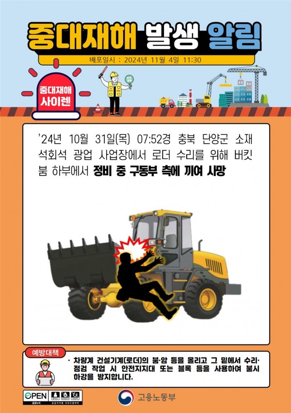 석회석 광업 사업장에서 로더 정비 중 구동부 측에 끼여 사망 페이지 정보 작성자 안전경영컨설팅 작성일24-11-11 08:45 조회3,266회 댓글0건 관련링크 이전글 다음글 목록 본문 . 댓글목록 등록된 댓글이 없습니다. 이전글 다음글 목록