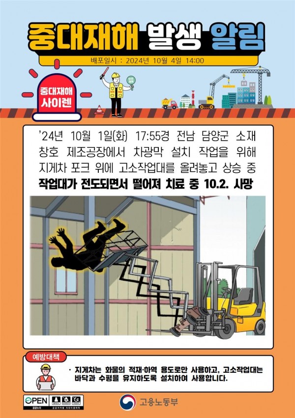 창호 제조공장에서 지게차 포크 위에 고소 작업대를 올려 놓고 작업 중 추락 페이지 정보 작성자 안전경영컨설팅 작성일24-11-11 08:46 조회2,733회 댓글0건 관련링크 이전글 다음글 목록 본문 . 댓글목록 등록된 댓글이 없습니다. 이전글 다음글 목록