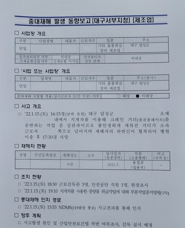 <중대재해> 지게차 철구조물 운반 작업중 구조물 넘어짐으로 인한 깔림