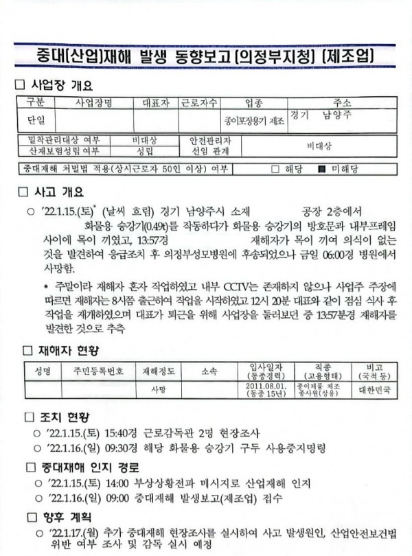 <중대재해> 화물용 승강기 작동 중 끼임